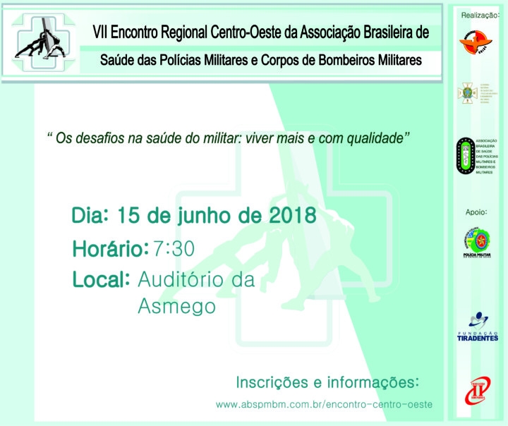 Goiânia receberá no dia 15 de junho, no Auditório da Asmego, o VII Encontro Regional Centro-Oeste da Associação Brasileira de Saúde das Polícias Militares e Corpos de Bombeiros Militares. O tema este ano será os desafios na saúde do militar: viver mais e com qualidade.